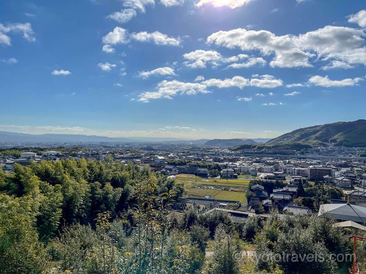 長い階段を登ったところにある境内からは明智光秀と豊臣秀吉が天下をかけて戦った山崎の戦い跡の古戦場を眺めることができる。